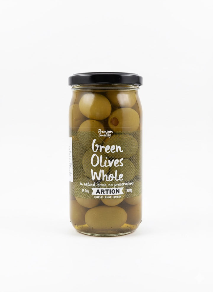 Savor the authentic taste of ARTION whole green olives, preserved in natural brine with no preservatives. These firm, plump olives deliver a true Mediterranean experience with every bite.